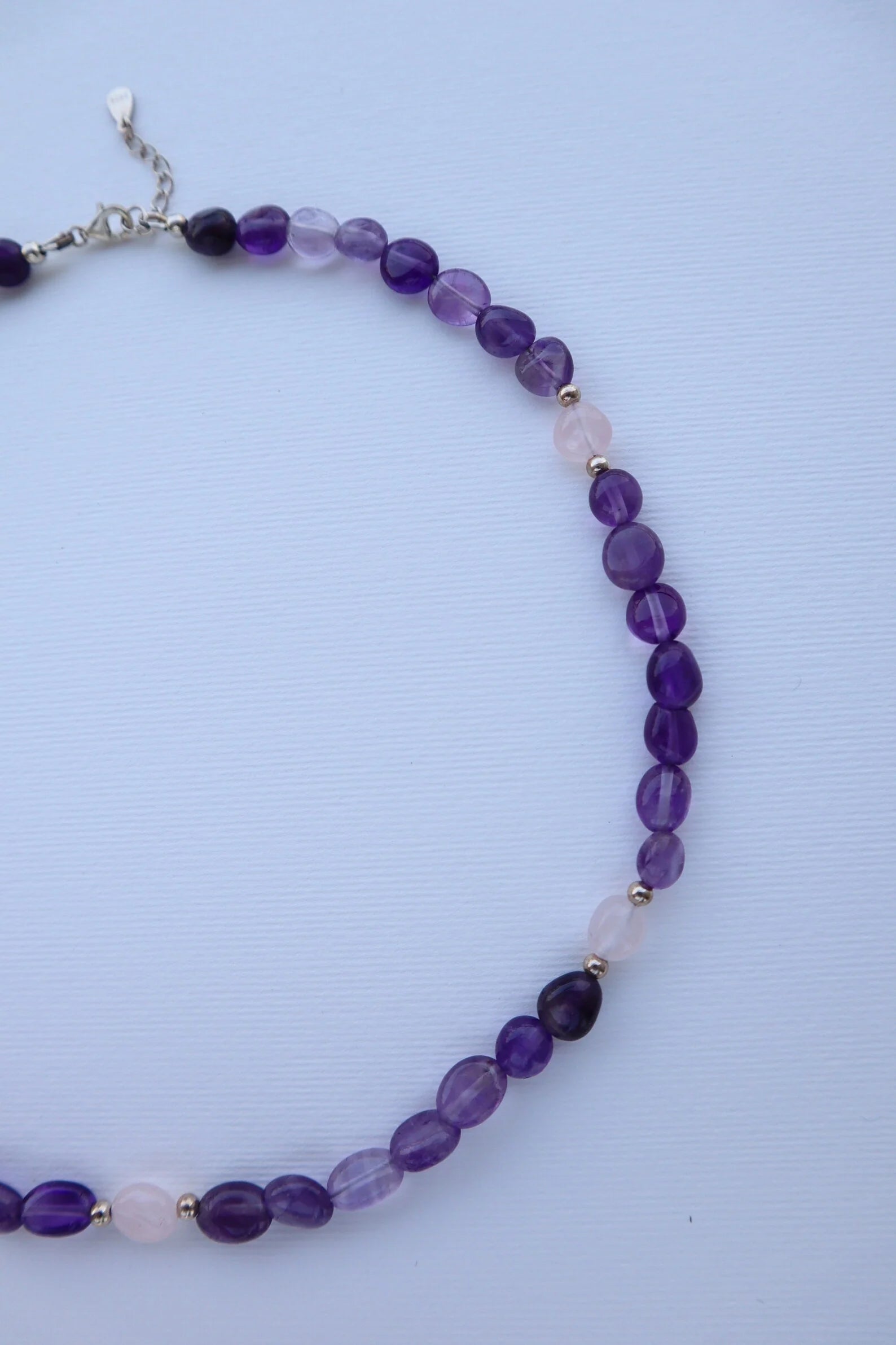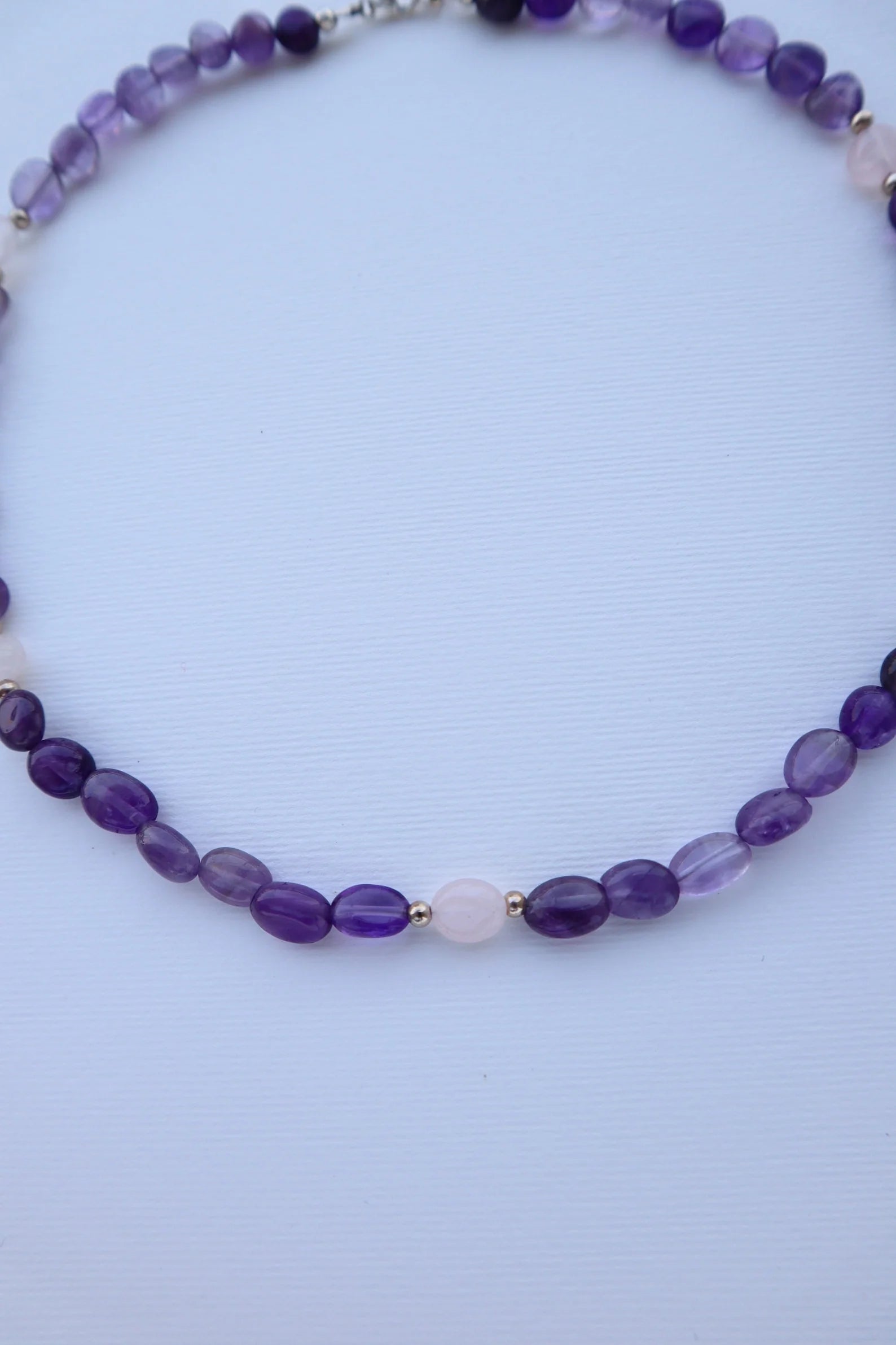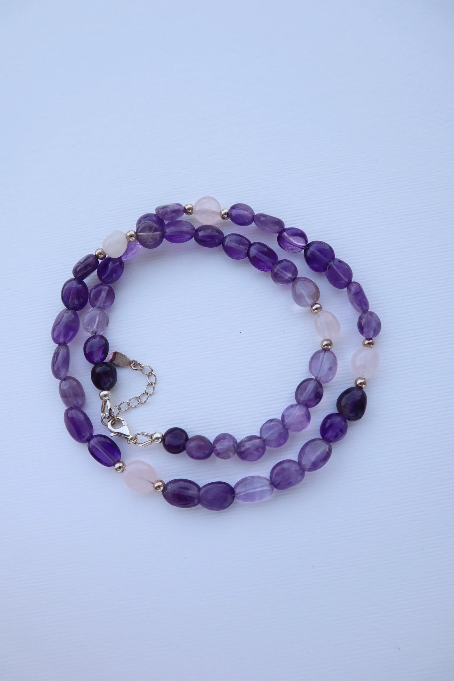 Amethyst calms the mind and uplifts the spirit, while rose quartz opens the heart to love, compassion, and emotional healing. Wear it to invite harmony within and around you.