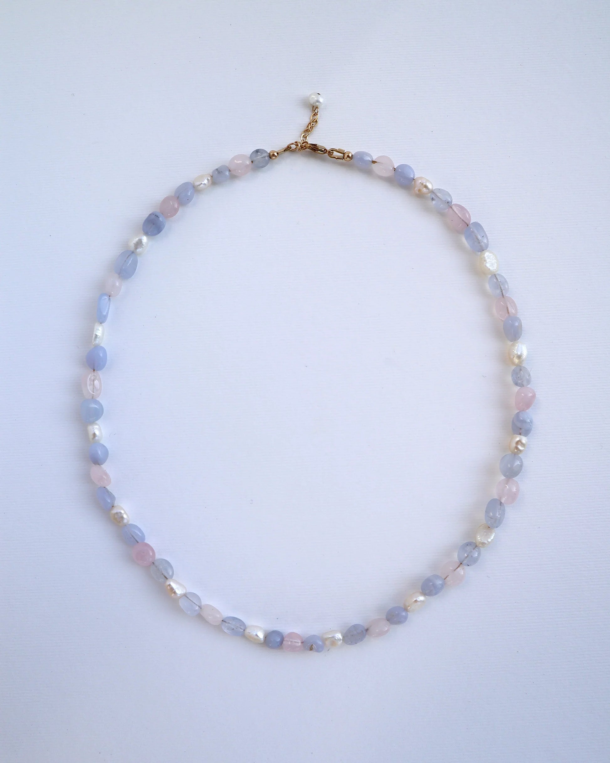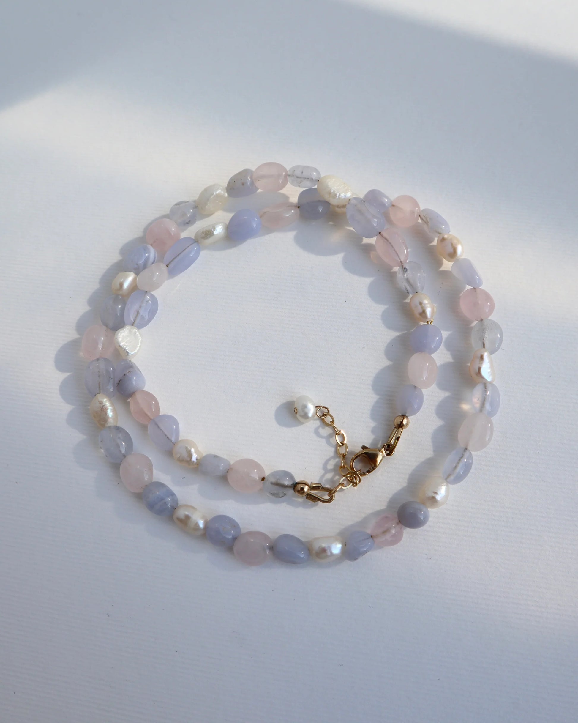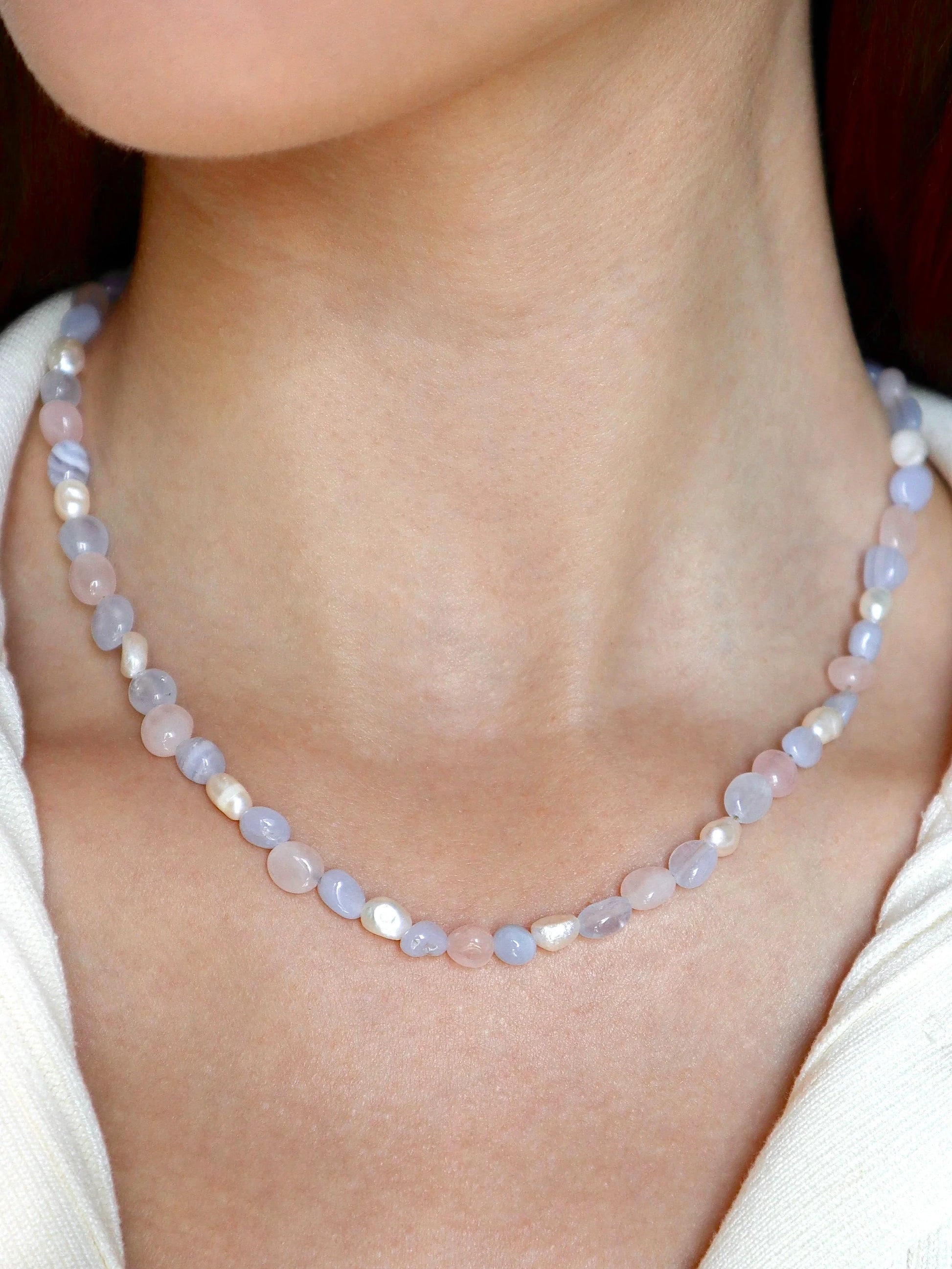 A soft trio for the soul: rose quartz, blue lace agate, and freshwater pearl—crafted to support emotional harmony and heart-led communication.